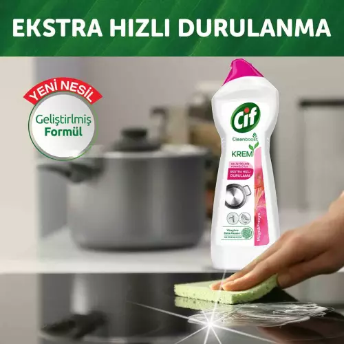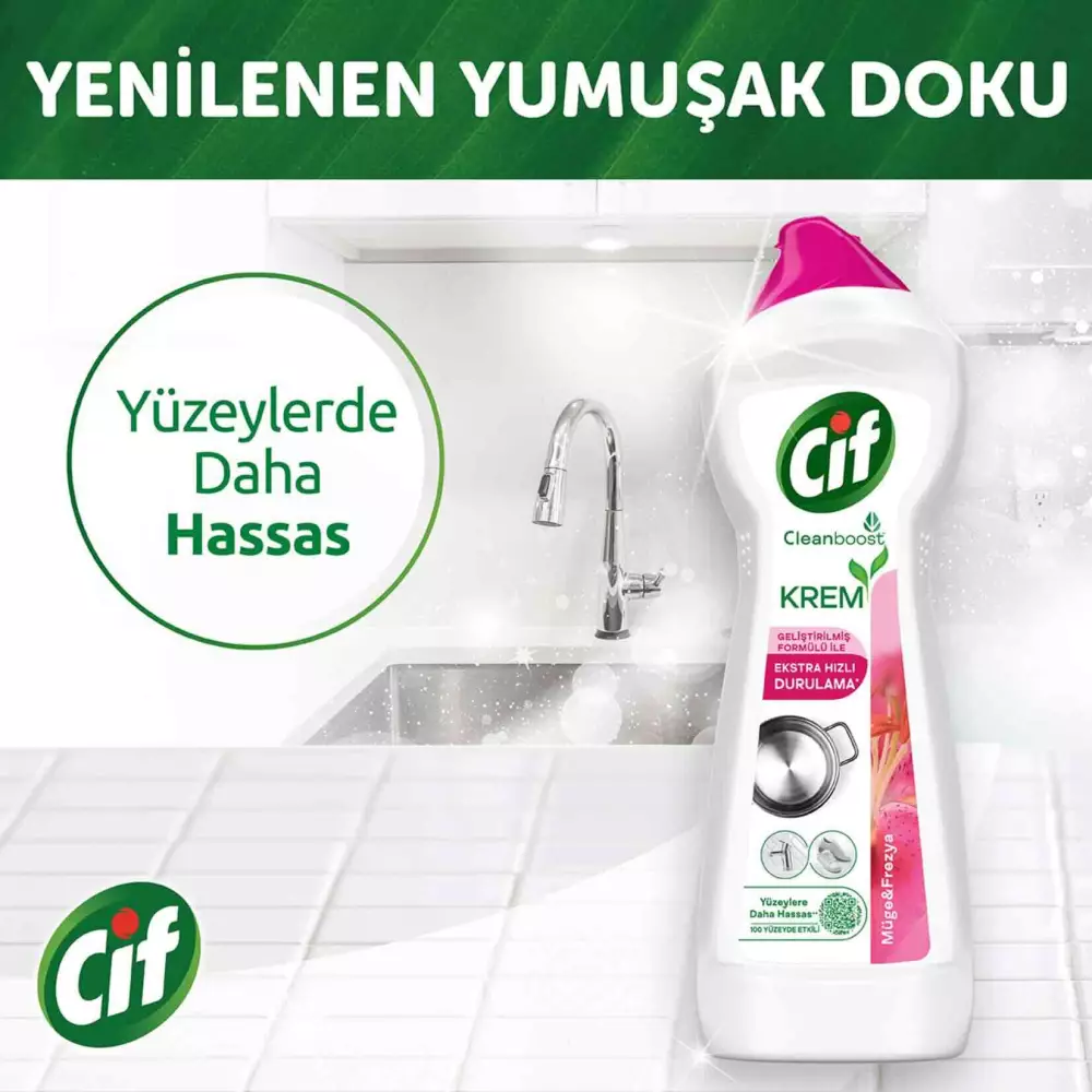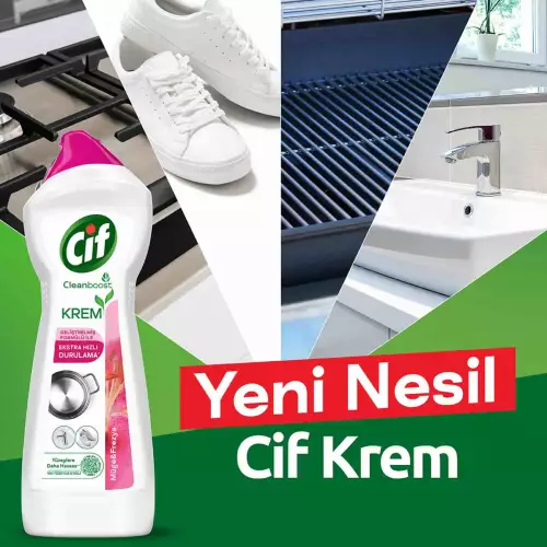 Cif Krem Yeni Nesil Yüzey Temizleyici Frezya ve Müge Çiçeği 750 ml, yenilenmiş güçlü formülü sayesinde en zorlu kir ve lekeleri kolayca temizler. Yüzeylere zarar vermeden hijyen sağlar ve parlaklık kazandırır. Frezya ve müge çiçeğinin ferah kokusu, temizlik sonrası uzun süre kalıcılığını korur. Mutfak, banyo, fayans, lavabo, ocak, tezgâh ve beyaz eşyalar gibi farklı yüzeylerde güvenle kullanılabilir. 750 ml’lik boyu günlük temizliklerde ekonomik ve uzun süreli kullanım imkânı sunar.