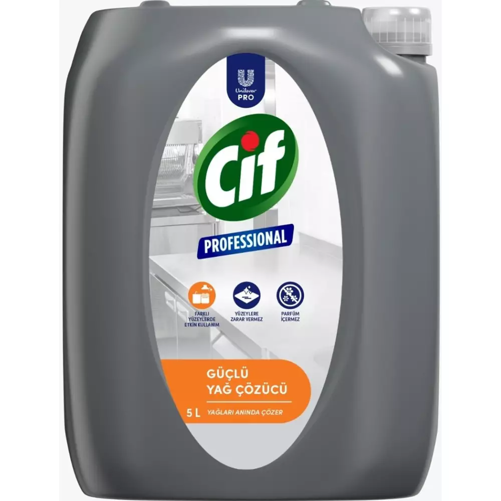 Cif Professional Güçlü Yağ Çözücü 5 Litre, özellikle profesyonel mutfaklar ve endüstriyel kullanım için geliştirilmiş güçlü bir temizlik ürünüdür. Konsantre formülü sayesinde en zorlu yağları, kurumuş kirleri ve yanmış yağ kalıntılarını kolayca çözer. Paslanmaz çelik, ocak, davlumbaz, fırın, ızgara ve mutfak ekipmanlarında güvenle kullanılabilir. Büyük 5 litrelik ekonomik ambalajı, yoğun kullanım alanlarında uzun süreli verimlilik sunar. Hijyen ve temizlik standartlarını üst seviyede tutmak isteyen restoran, otel, fabrika mutfakları ve catering işletmeleri için idealdir. Güçlü formülü sayesinde minimum çaba ile maksimum hijyen sağlar.