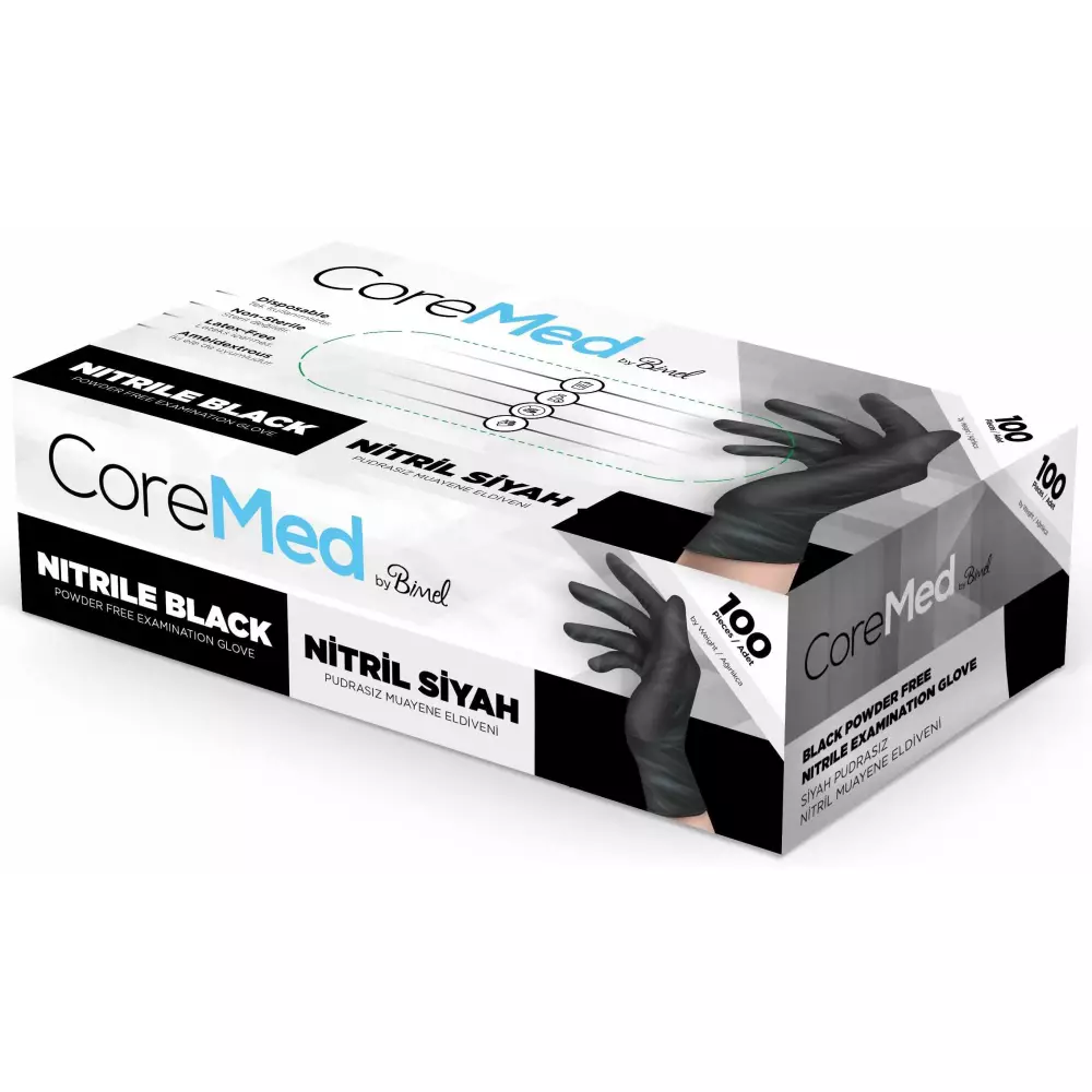 CoreMed Pudrasız Siyah Nitril Muayene Eldiveni, profesyonel kullanım gerektiren alanlar için tasarlanmış, yüksek dayanımlı ve estetik görünüme sahip tek kullanımlık nitril eldivendir. Özellikle gıda, temizlik, sağlık ve teknik işlerde hem hijyen hem de güçlü koruma beklentisini karşılamak üzere geliştirilmiştir.