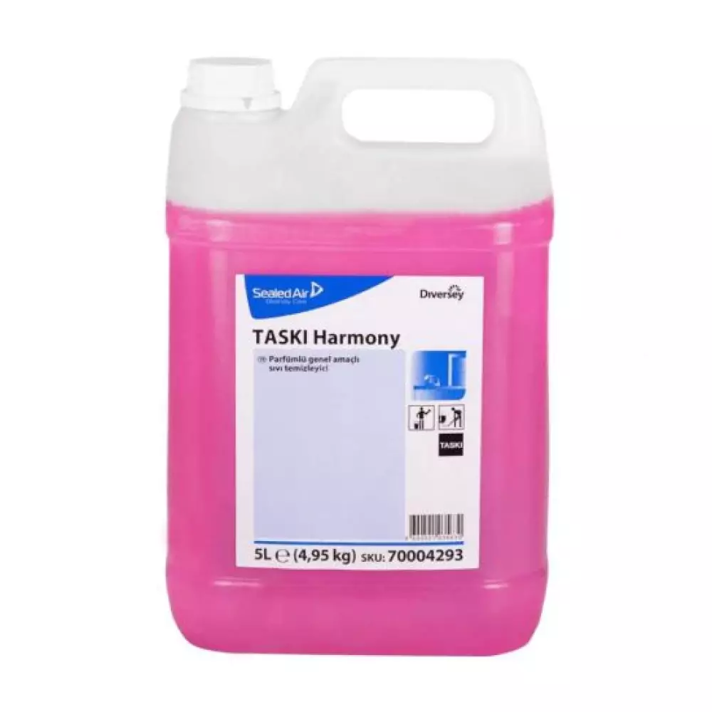 Diversey Taski Harmony Parfümlü Genel Temizlik Maddesi 5 Litre (70004293), suya dayanıklı tüm sert yüzeylerde günlük temizlik için geliştirilmiş, iz bırakmayan, parfümlü, profesyonel bir genel yüzey temizleyicidir. Özel formülü sayesinde yerlerde ve yüzeylerde yapışkanlık bırakmadan derinlemesine temizlik ve parlaklık sağlar; güçlü kir çözücü etkisiyle mutfaktaki yağlı lekelerden banyodaki ağır kirlere kadar birçok zorlu noktada yüksek performans sunar. Hoş ve ferah kokusu sayesinde temizlik sonrası ortamda uzun süre kalıcı bir temizlik hissi bırakır. Durulama gerektirmeyen yapısı ile özellikle yoğun insan trafiğine sahip ofis, otel, AVM, okul, hastane ve benzeri kurumsal alanlarda hem zaman hem iş gücü tasarrufu sağlar. Cam ve cilalı parke gibi hassas yüzeylerde güvenle kullanılabilmesi, ürünün hem bakım hem de hijyen açısından çok yönlü bir çözüm olmasını sağlar. 5 litrelik ekonomik ambalajı ile geniş metrajlı alanların günlük temizliği için ideal, profesyonel bir kimyasal temizlik ürünüdür.