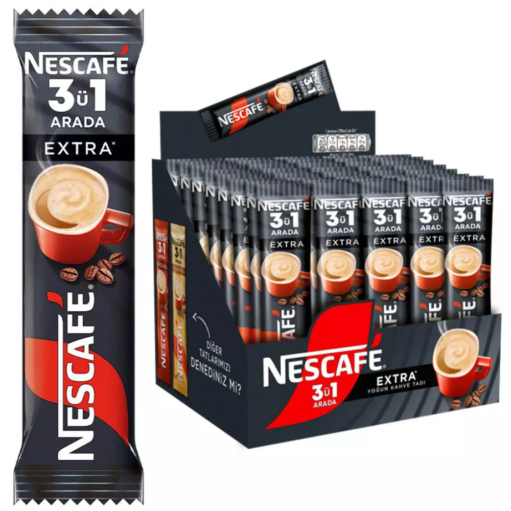 Nescafe 3'ü 1 Arada Extra Kahve 16.5 gr 48'li Paket, yoğun kahve tadını sevenler için özel olarak geliştirilmiş formülüyle pratik ve lezzetli bir kahve deneyimi sunar. Şeker, krema ve kahvenin ideal dengesi sayesinde her fincanda standart kalite sağlar. Extra kahve oranı ile klasik 3’ü 1 arada ürünlere kıyasla daha tok ve belirgin bir aroma sunar. Ofisler, fabrikalar, toplantı salonları, oteller ve yoğun çalışan ekipler için ekonomik ve hızlı tüketim avantajı sağlar. Tek kullanımlık saşe ambalajı sayesinde hijyenik, ölçüsü tam ve her zaman aynı lezzettedir.