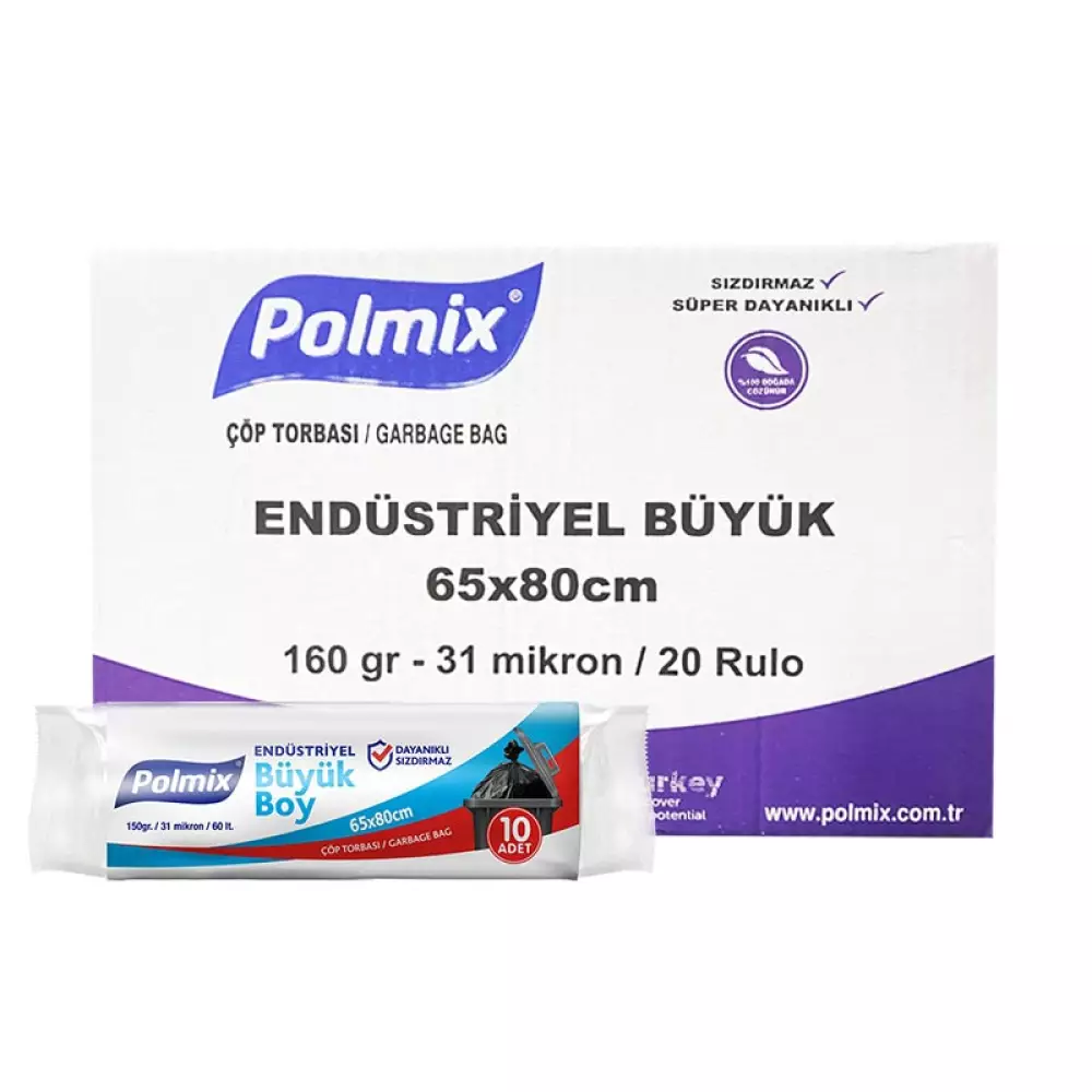 • Polmix P402 Çöp Torbası Endüstriyel Büyük Boy 65x80 Siyah - 10’lu x 25 Rulo Koli