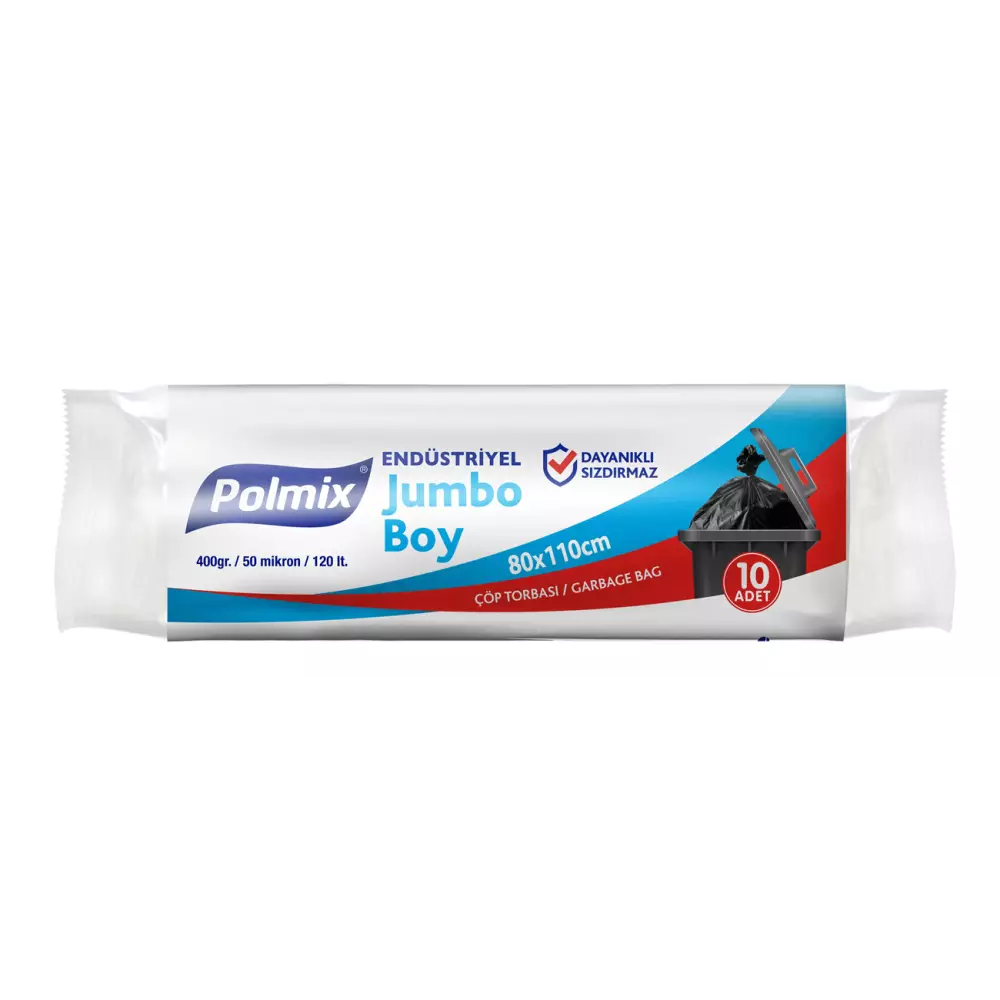 Polmix P404 Endüstriyel Jumbo Boy Çöp Torbası, ağır ve hacimli atıklar için geliştirilmiş, yüksek yoğunluklu polietilen (HDPE) hammaddeden üretilen dayanıklı bir çöptorbasıdır. 80x110 cm ölçüsüyle endüstriyel çöp kovalarına tam uyum sağlar ve yüksek mikron kalınlığı sayesinde yırtılmaya, delinmeye ve sızdırmaya karşı maksimum direnç gösterir. Her ruloda 10 adet torba bulunur ve rulo ağırlığı 400 gramdır. Bu sayede Polmix P404, özellikle fabrika, otel, hastane, restoran, okul, AVM ve temizlik firmaları gibi yoğun atık üreten işletmeler için uzun ömürlü, güvenli ve hijyenik bir kullanım sunar. Siyah rengi sayesinde atıkların görünmesini engeller, hijyenik ve estetik bir görünüm sağlar. Polmix’in endüstriyel serisindeki Jumbo Boy P404 modeli, profesyonel temizlik operasyonları için ideal bir tercihtir.