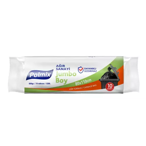Polmix P501 Ağır Hizmet Jumbo Boy Çöp Torbası, yüksek yoğunluklu polietilen (HDPE) hammaddeden üretilmiş, ekstra kalın mikron yapısıyla en zorlu endüstriyel koşullarda bile maksimum dayanıklılık sunan profesyonel bir üründür. 80x110 cm ölçüsü ve 600 gram rulo ağırlığı sayesinde ağır, keskin veya hacimli atıkların taşınmasında güvenli performans sağlar. Her ruloda 10 adet çöp torbası bulunur. Ağır hizmet sınıfında yer alan bu model, özellikle fabrika, otel, hastane, restoran, okul, AVM ve temizlik firmaları gibi yüksek atık hacmine sahip alanlarda kullanıma uygundur. Kalın dokusu sayesinde yırtılmaz, delinmez ve sızdırmaz yapıdadır. Polmix P501, endüstriyel atık yönetiminde güç, güven ve dayanıklılığı bir araya getirir. Siyah rengi hijyen ve gizlilik açısından avantaj sağlar; profesyonel temizlik standartlarını destekler.